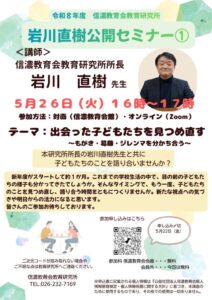 | ①Ⅰ | 5月26日(火) 16:00~17:00 | 対面(信濃教育会館) オンライン(Zoom) | 岩川直樹 所 長 | お申込みはこちら |