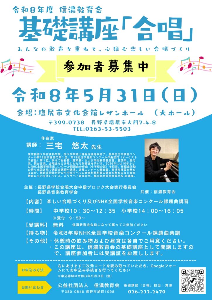 トップ 〉 お知らせ・ご案内 〉 講習・講座 〉 令和8年度 基礎講座「合唱」参加者募集中です!